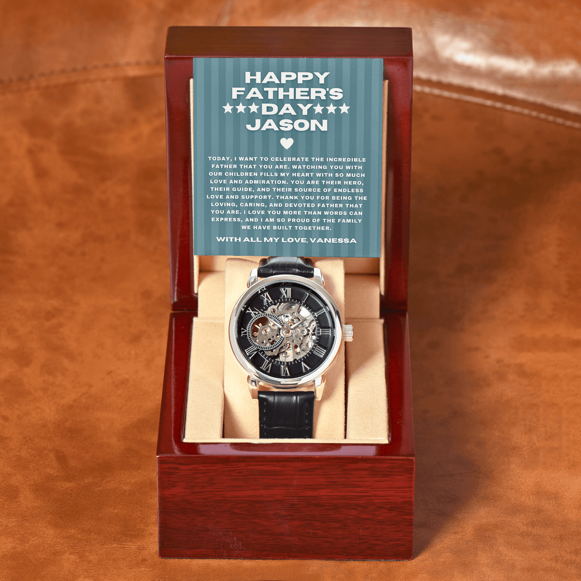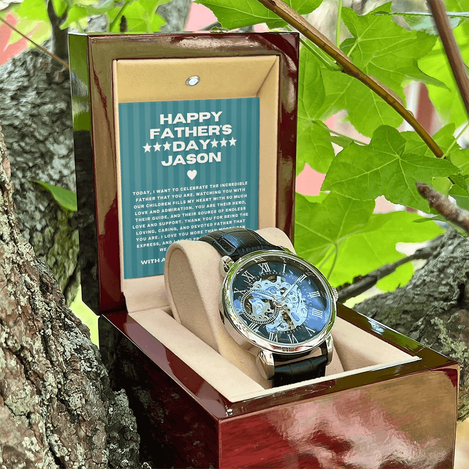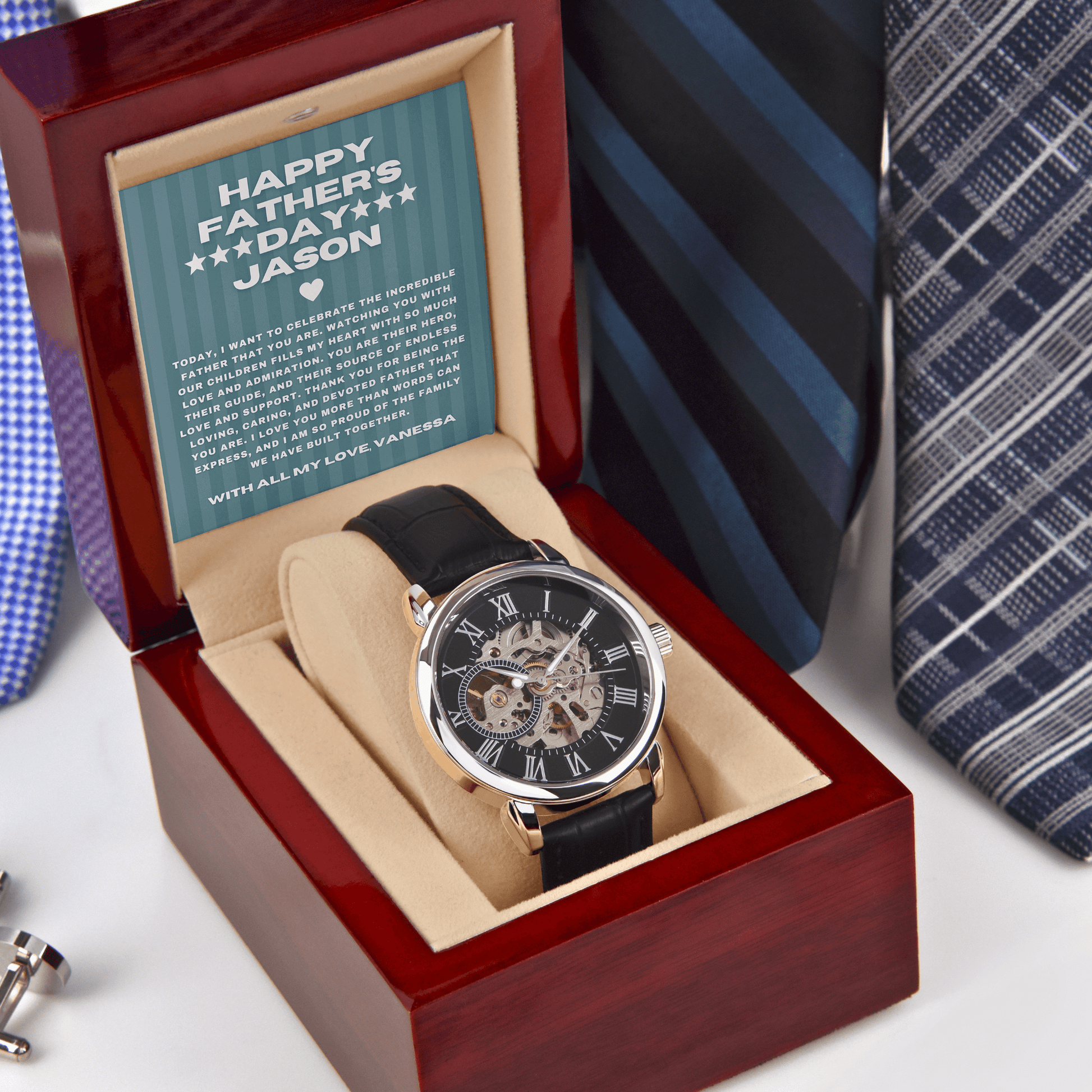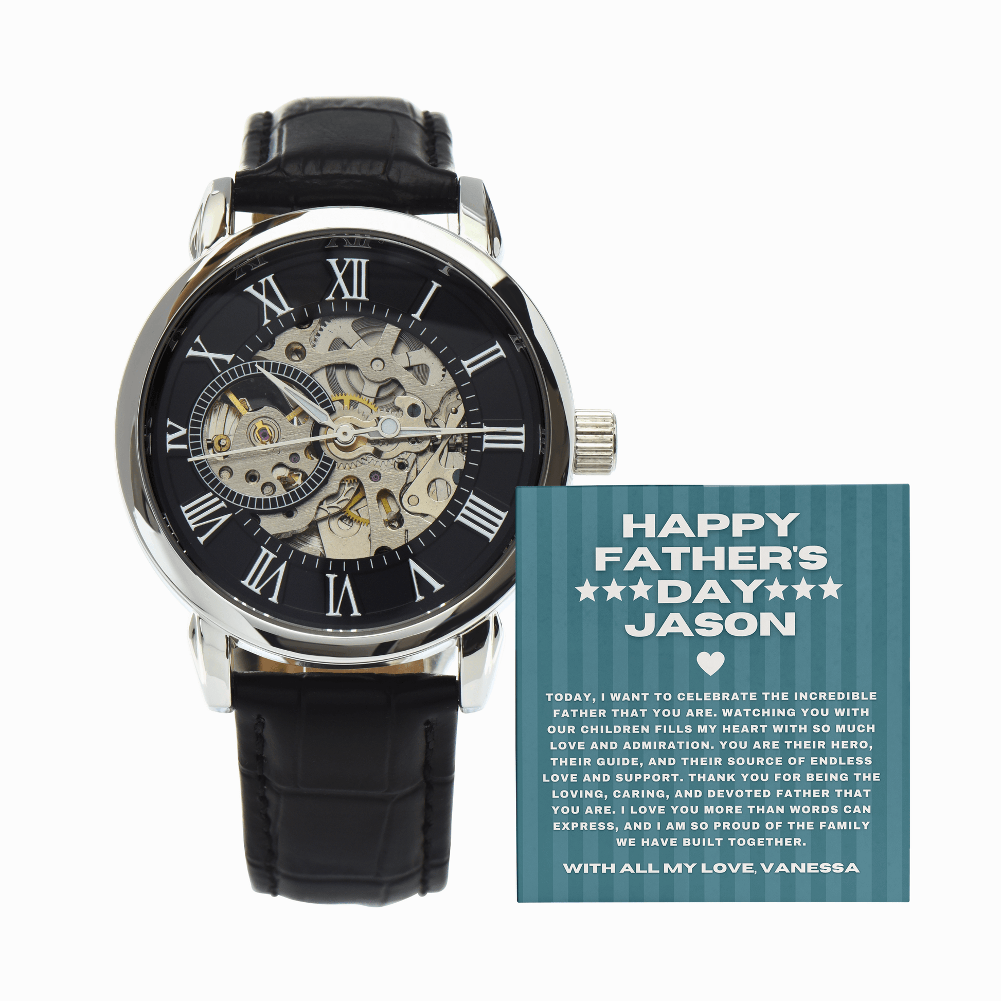 Celebrate the incredible father your husband is with the perfect Father’s Day gift – the Men's Openwork Watch. Accompanied by a heartfelt, personalized message, this luxurious timepiece is a beautiful way to show your love and appreciation.