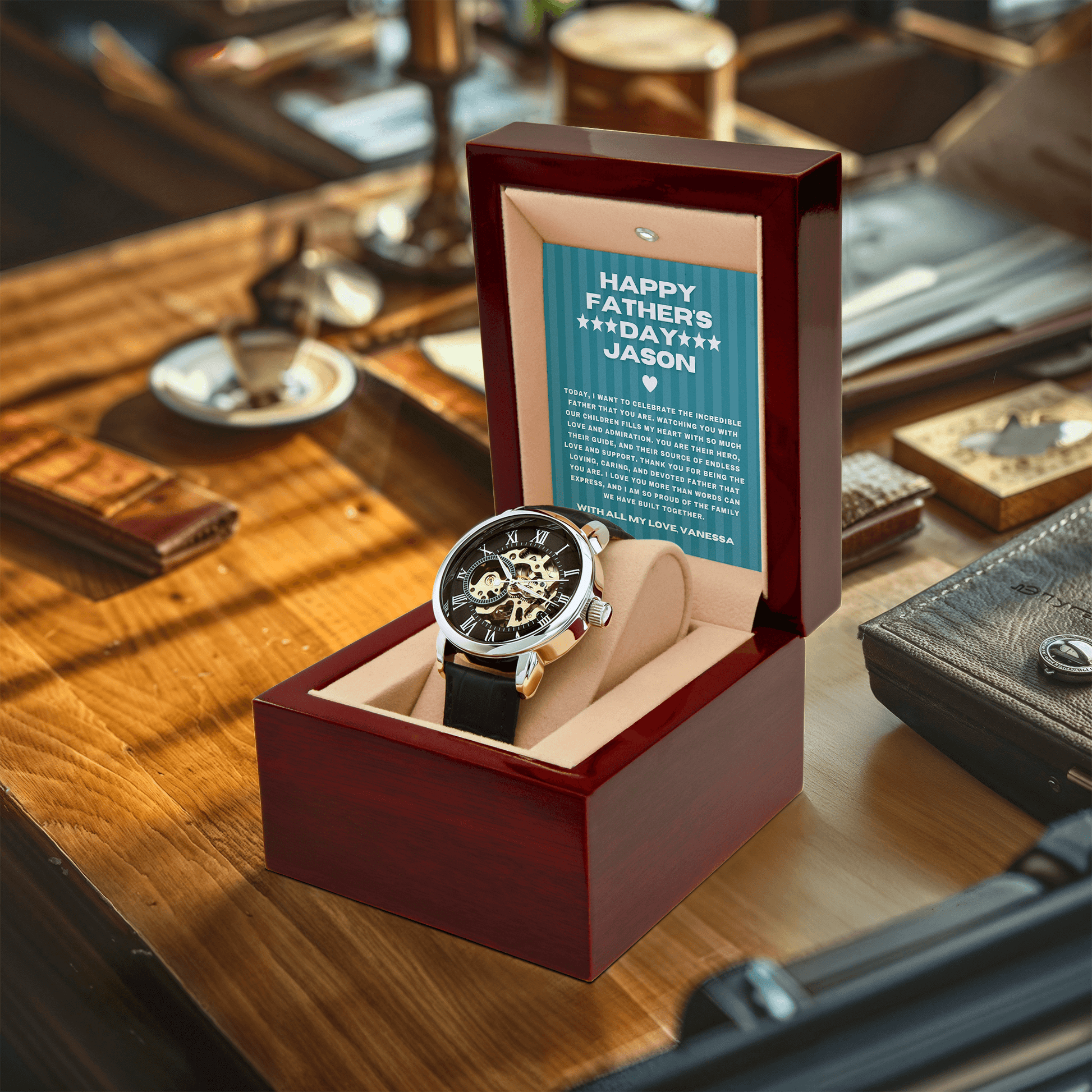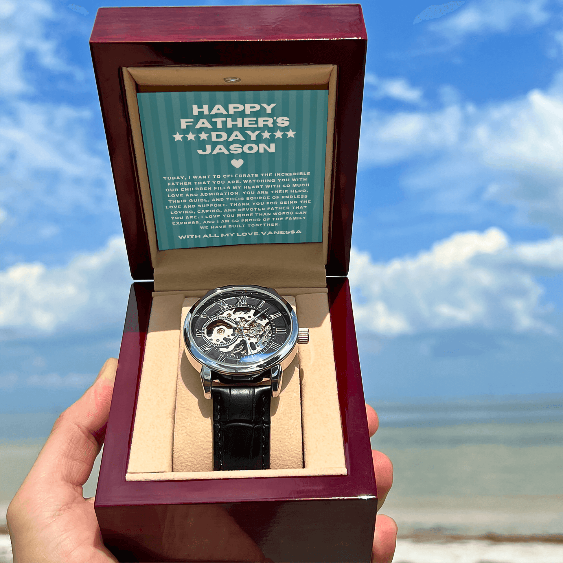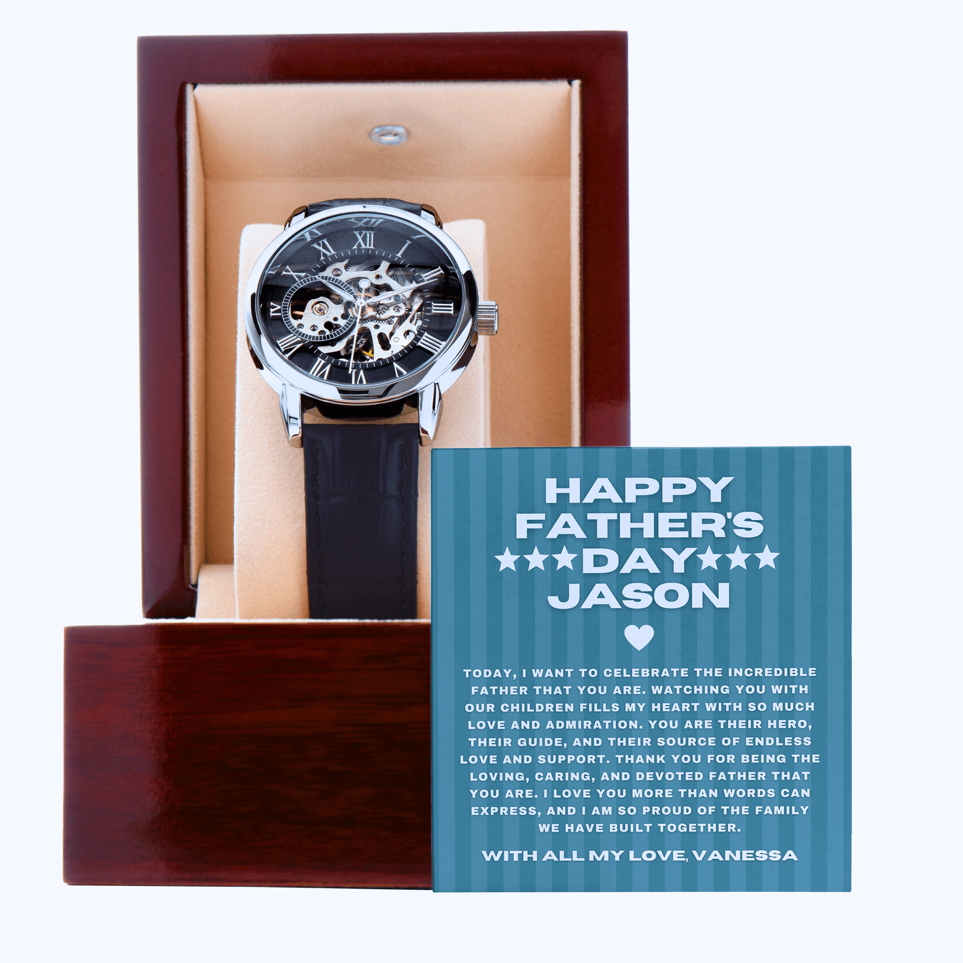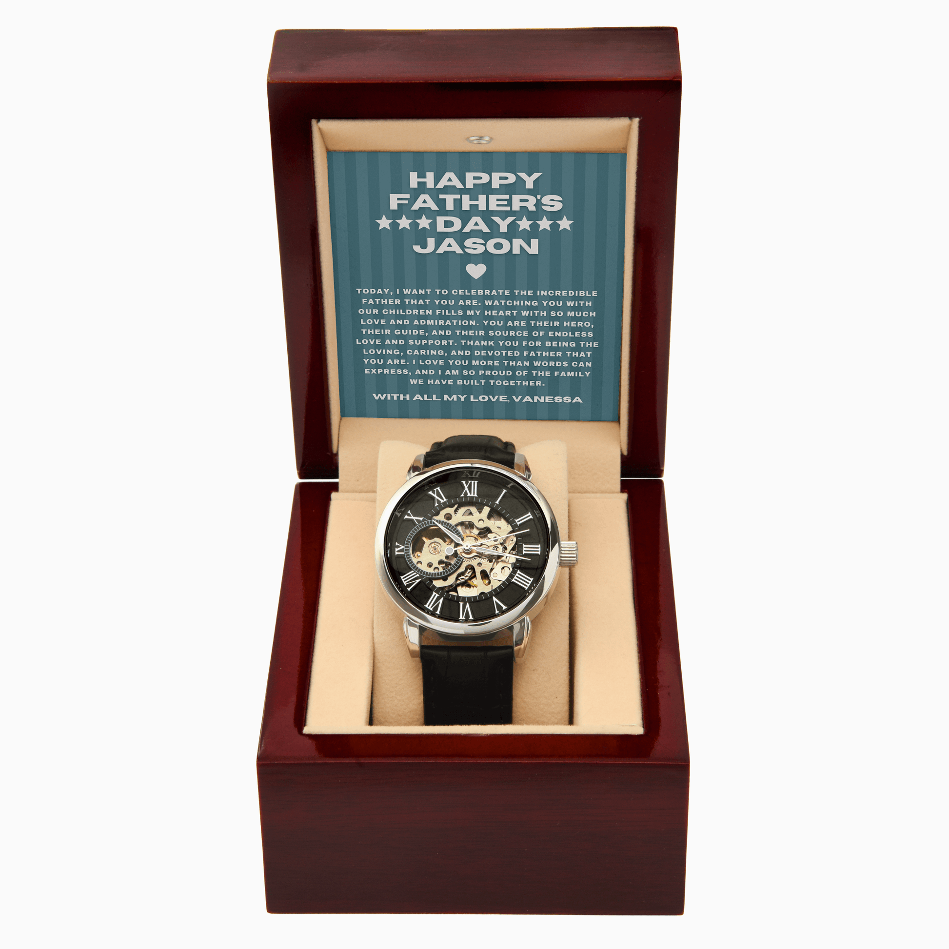 Celebrate the incredible father your husband is with the perfect Father’s Day gift – the Men's Openwork Watch. Accompanied by a heartfelt, personalized message, this luxurious timepiece is a beautiful way to show your love and appreciation.