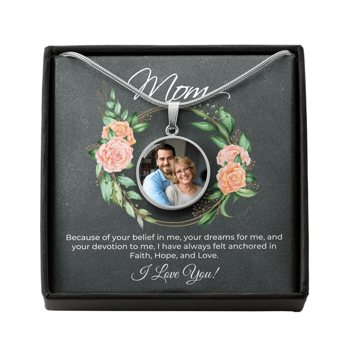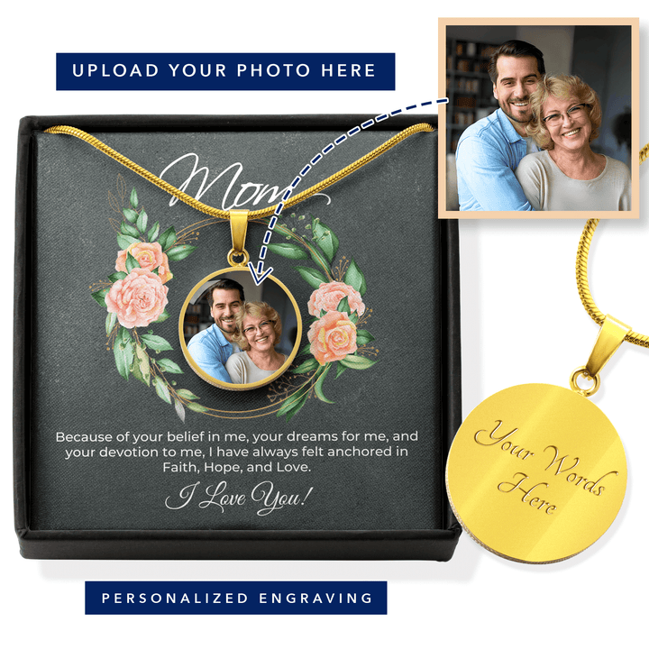 Express your deep love and gratitude to your mom with the exquisite Personalized Circle Necklace. This remarkable piece is not only a symbol of your unbreakable bond but also a heartfelt tribute to her unwavering support and devotion. With its meaningful message card that says, "Mom - Because of your belief in me, your dreams for me, and your devotion to me, I have always felt anchored in Faith, Hope, and Love. I Love You!" this gift will touch her heart like never before.