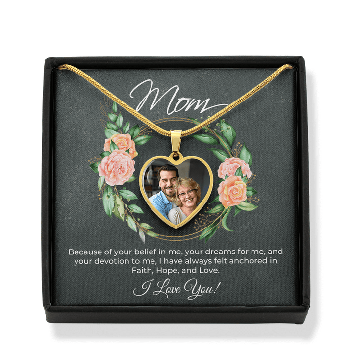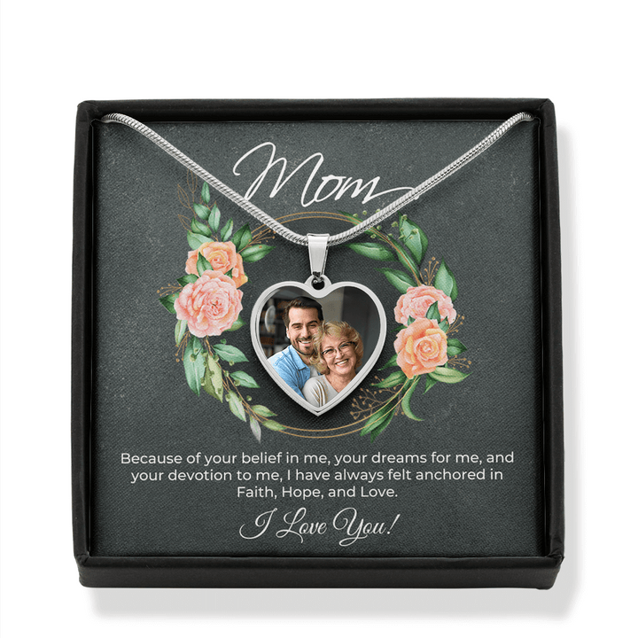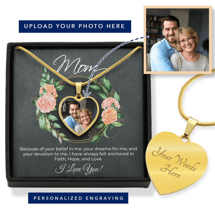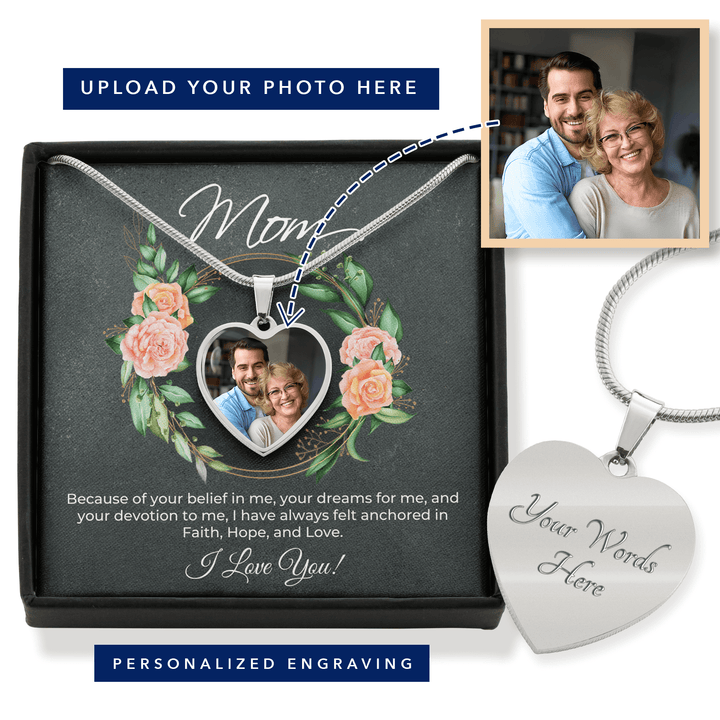 Express your deep love and gratitude to your mom with the exquisite Personalized Heart Necklace. This remarkable piece is not only a symbol of your unbreakable bond but also a heartfelt tribute to her unwavering support and devotion. With its meaningful message card that says, "Mom - Because of your belief in me, your dreams for me, and your devotion to me, I have always felt anchored in Faith, Hope, and Love. I Love You!" this gift will touch her heart like never before.