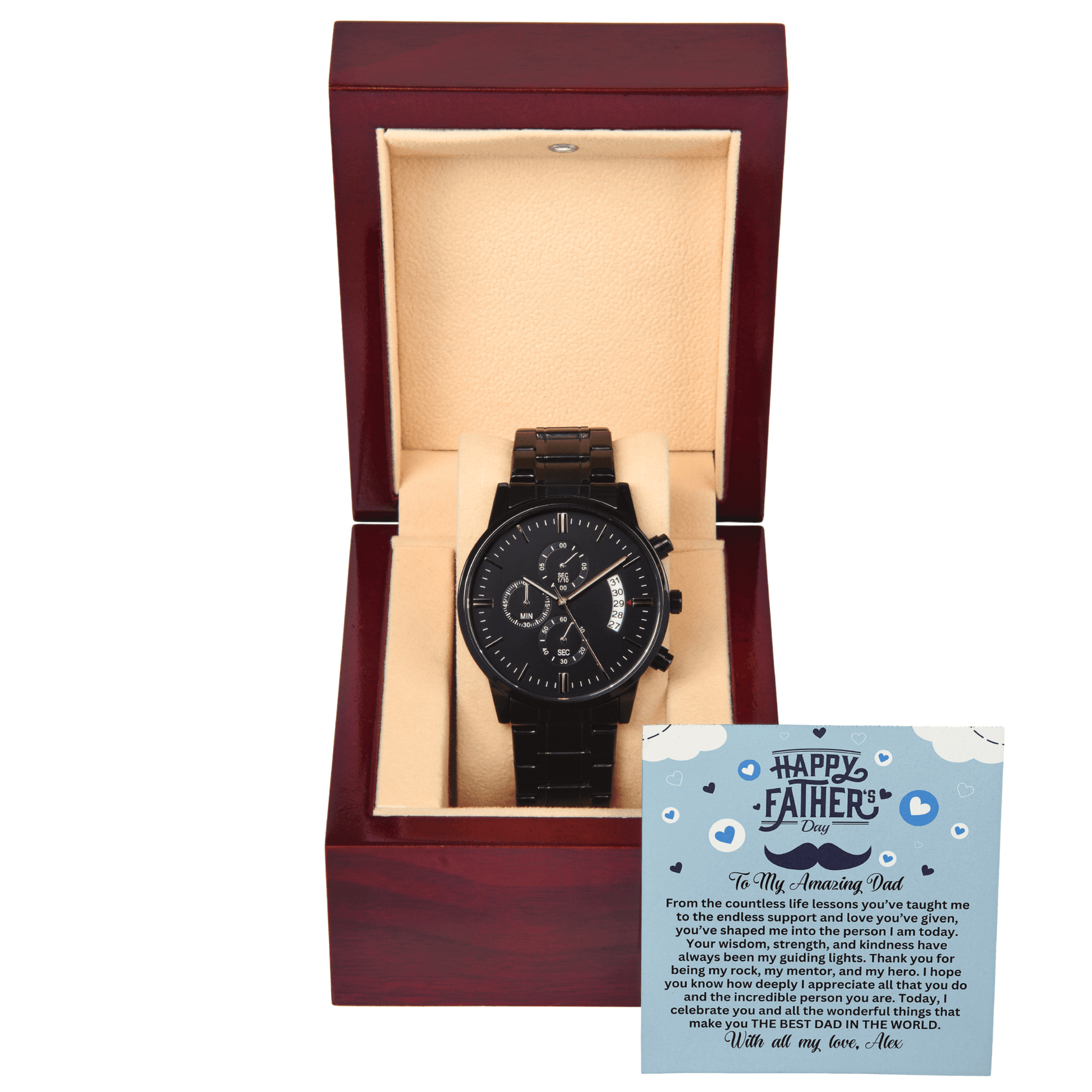 A timeless piece that combines elegance and durability, this Black Chronograph Watch is the perfect Father's Day gift for your amazing dad. Crafted with high-quality Stainless Steel and featuring a sophisticated Copper Dial, it’s designed to withstand constant use while maintaining its stylish appeal. The watch boasts a three-dial face, a calendar function, and luxury pointers, all housed in a water-resistant and scratch-proof case.