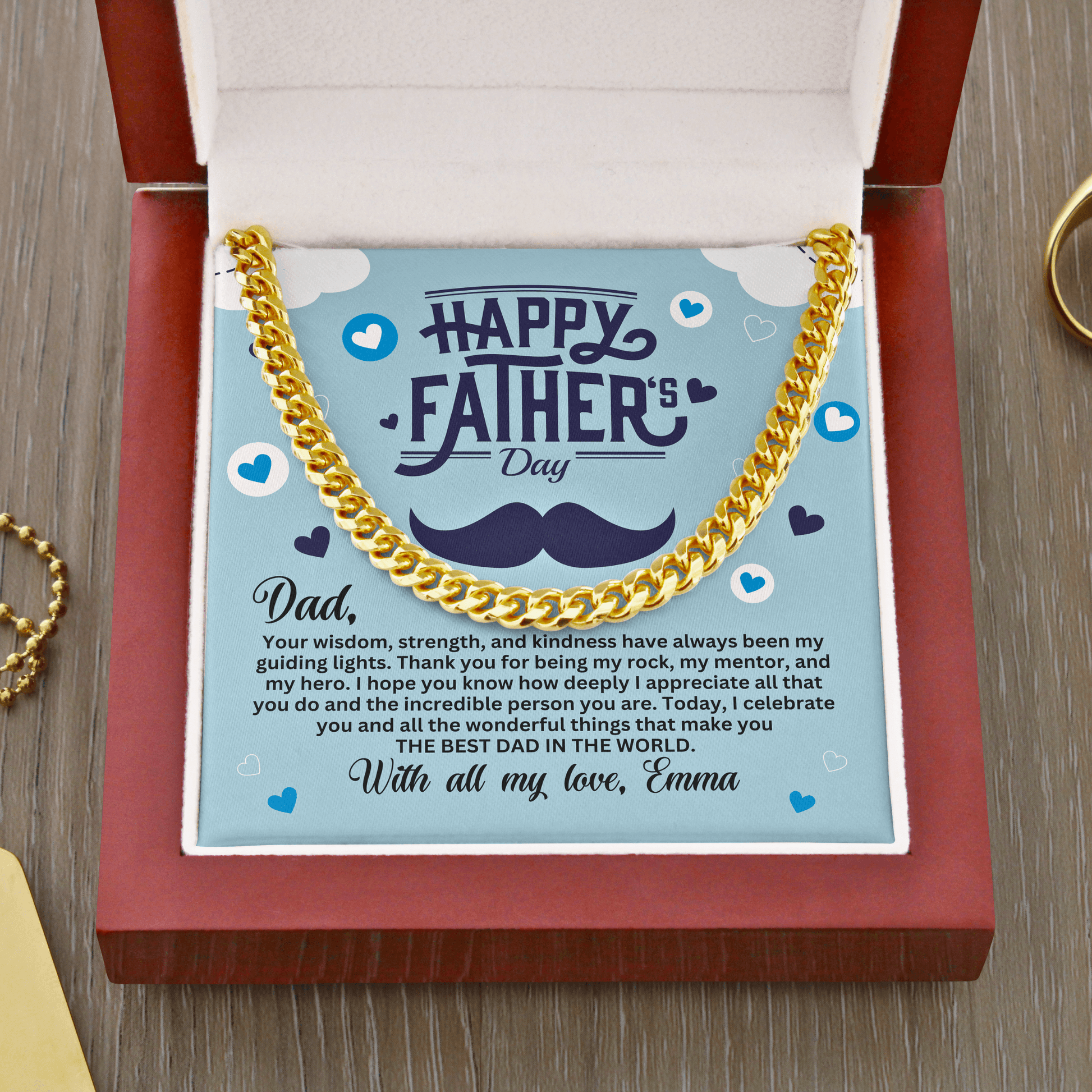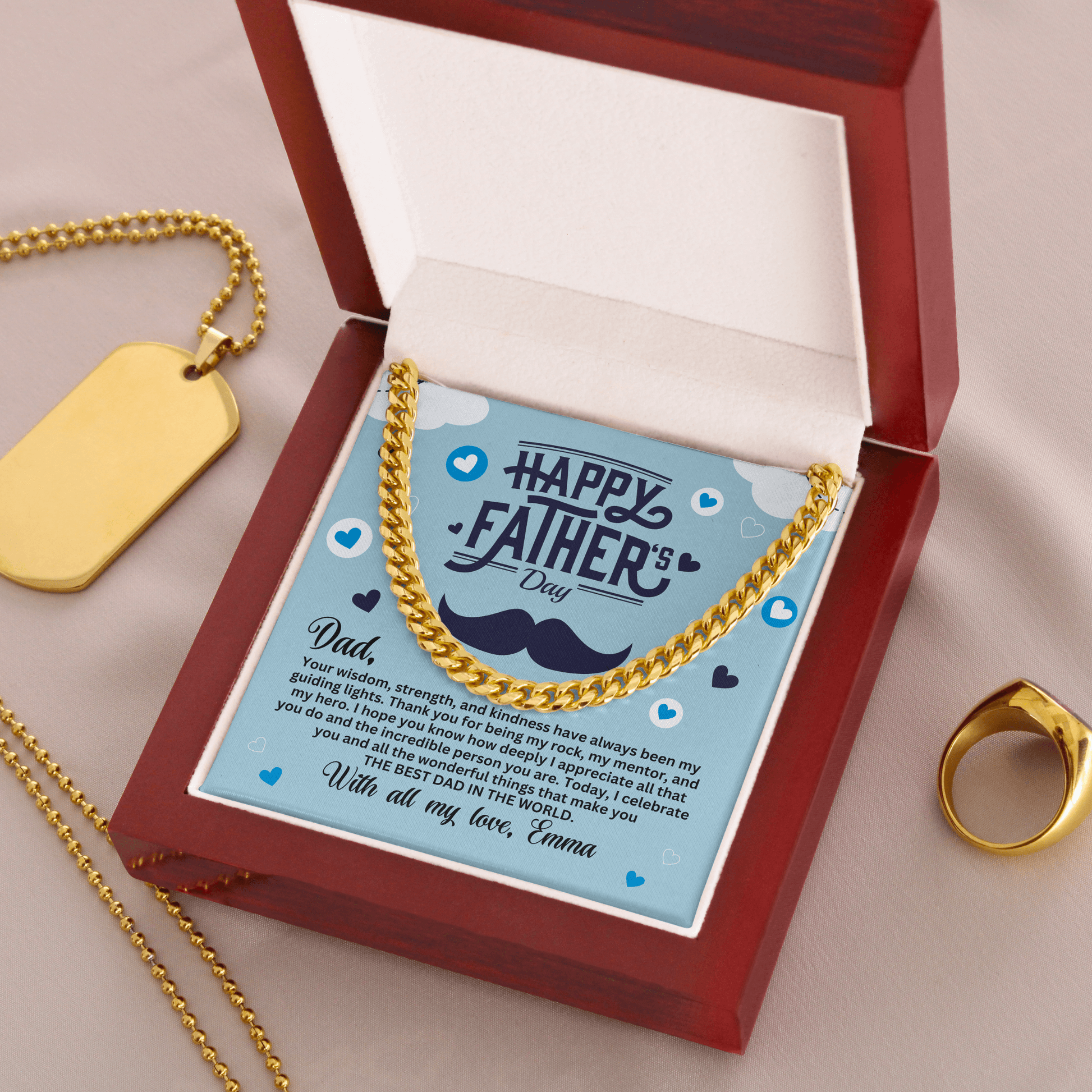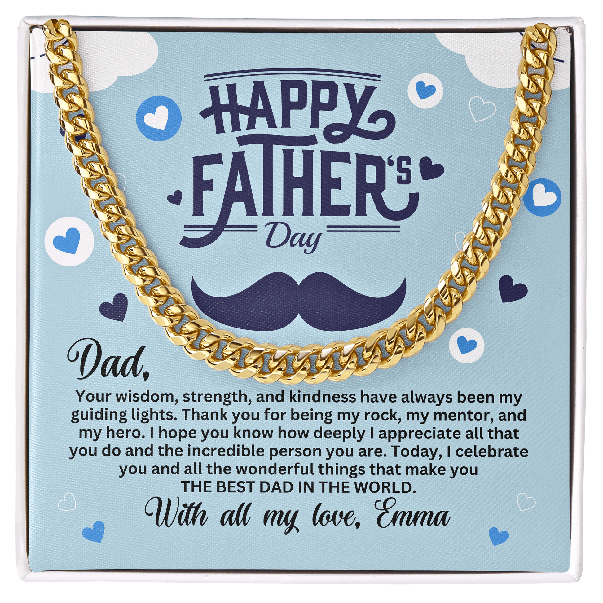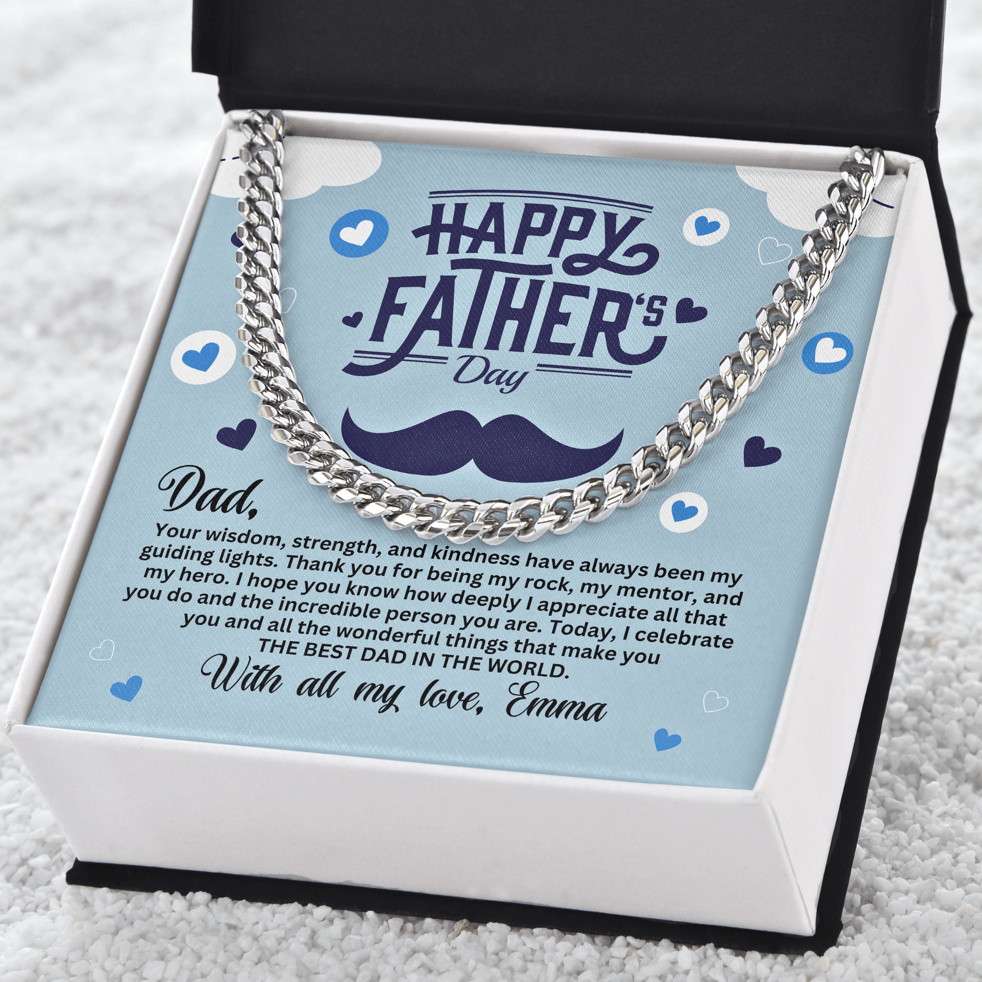 Looking for the perfect Father’s Day gift for the dad who wants nothing or already has everything? Celebrate dad with this timeless Cuban Link Chain, a cool Father’s Day necklace that’s both classy and stylish. This necklace is not just a piece of jewelry; it's a heartfelt, sentimental gift for dad from daughter or son, complete with a personalized message card that makes it truly special.