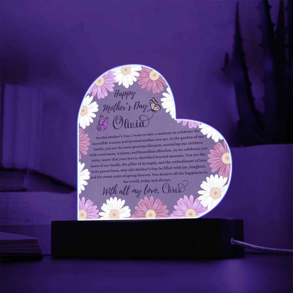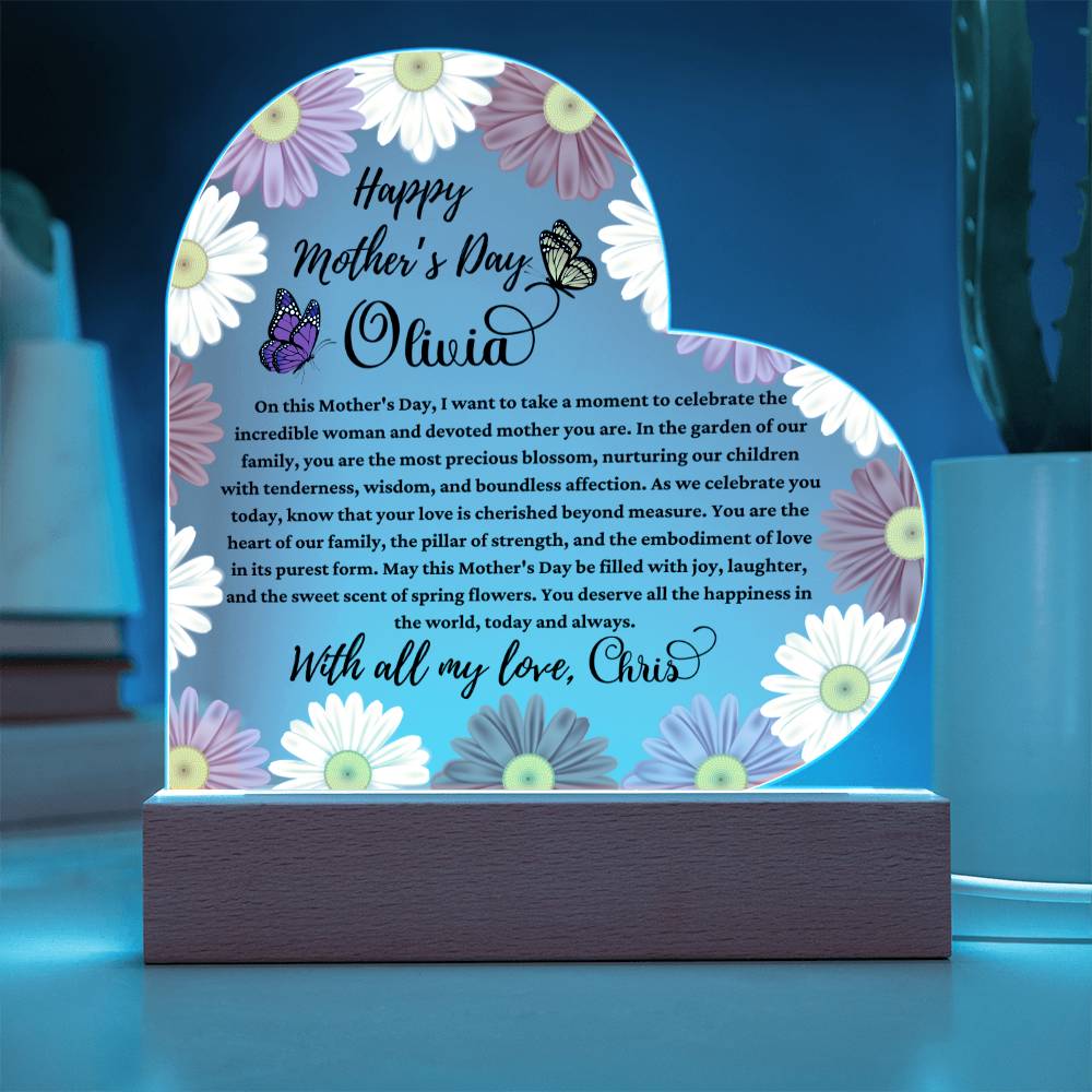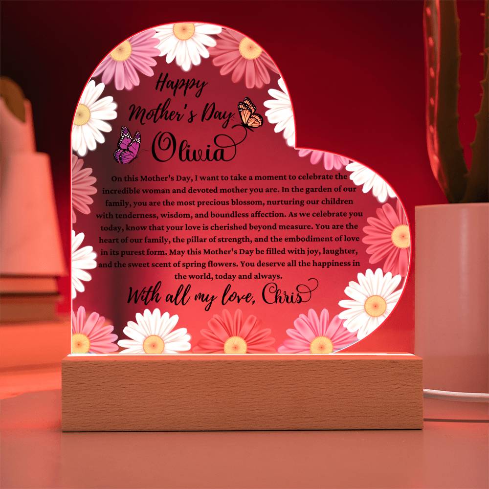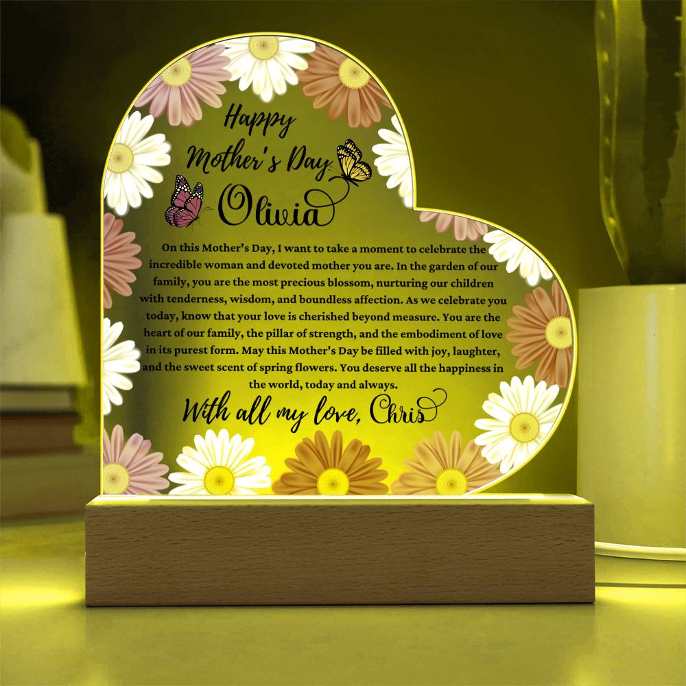 Celebrate the extraordinary woman who fills your life with love and warmth with our Happy Mother’s Day Acrylic Heart Plaque, the perfect gift from a husband to his beloved wife. Personalized with her name and adorned with a heartfelt message straight from your heart, this plaque is a touching tribute to her unwavering devotion.